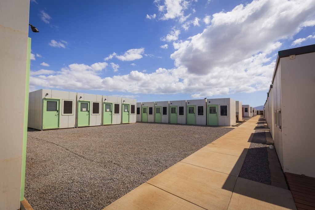 The 64 homes are grouped into four clusters, each with shared kitchens, showers and flex spaces designed for privacy and connection. The site also includes a community center, laundry facility, offices for community management and service providers, and a dedicated dog park for residents to remain with their pets.